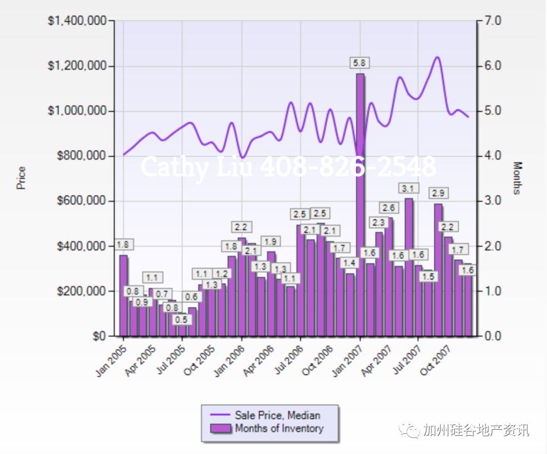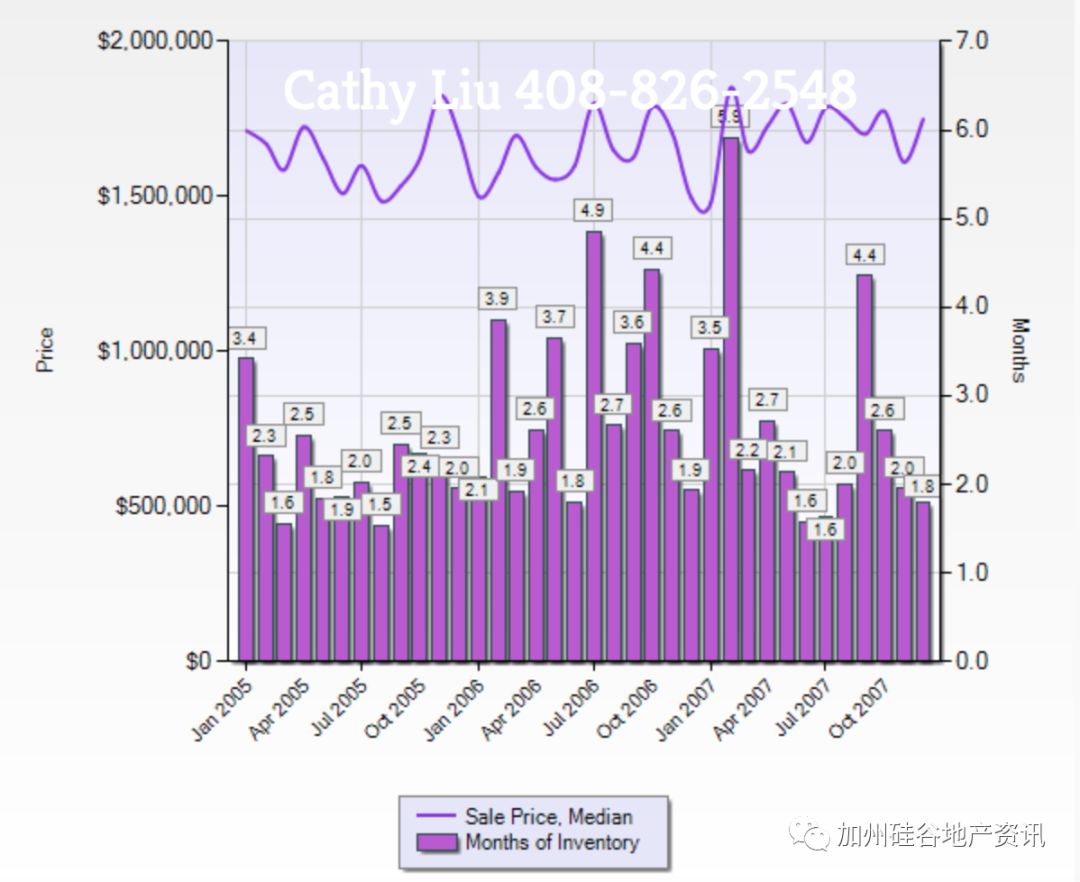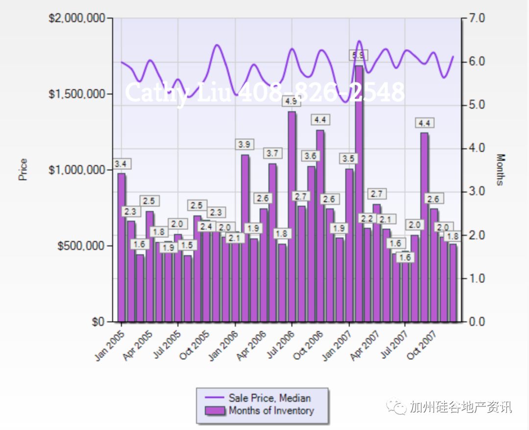 因为房屋的价格和房屋库存量相关,我把每个月对应的库存量也画了出来,给大家参考。这个值是months of inventory, 顾名思义就是需要多少个月把这些库存量消化掉。这个值越高,表明市场上的库存房屋就越多。我在去年10月的文章“南湾最新市场分析“ 比较详细的分析了房价受供求关系的影响,这里就不多说了。